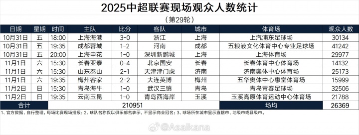 2025中超职业联赛 现场观赛人群 人数统计(第29轮)