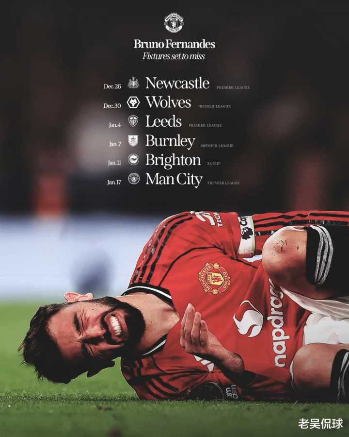 上周末出征维拉公园,曼联1比2落败,结束了4轮不败的小小高潮,输球的同时伴随巨大打击,领队 B·费尔南德斯跟腱负伤 ,坚守 了半场还是顶不住在中场球员休息时退下火线。据悉,他将休战几周,而这正好是赛事最密集、还因非洲杯被迫减员的时期。