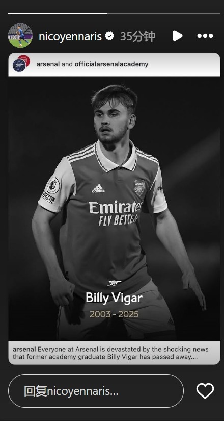李可更新社媒,悼念去世的前阿森纳青训球员比利-维加