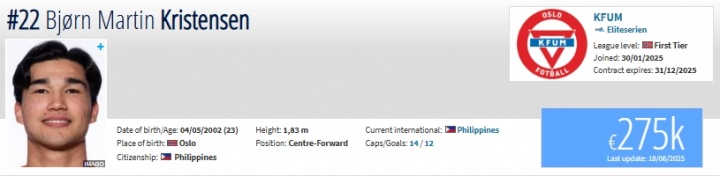 马丁-克里斯滕森,现年23岁,苏超直播效力于挪超KFUM,德回转 价27.5万欧。他的母亲是菲律宾人,2024年9月他正式归化菲律宾,代表菲律宾出场14次打进12球。