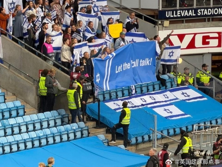 挪威5比0以色列赛事 中两队球迷打出的横幅