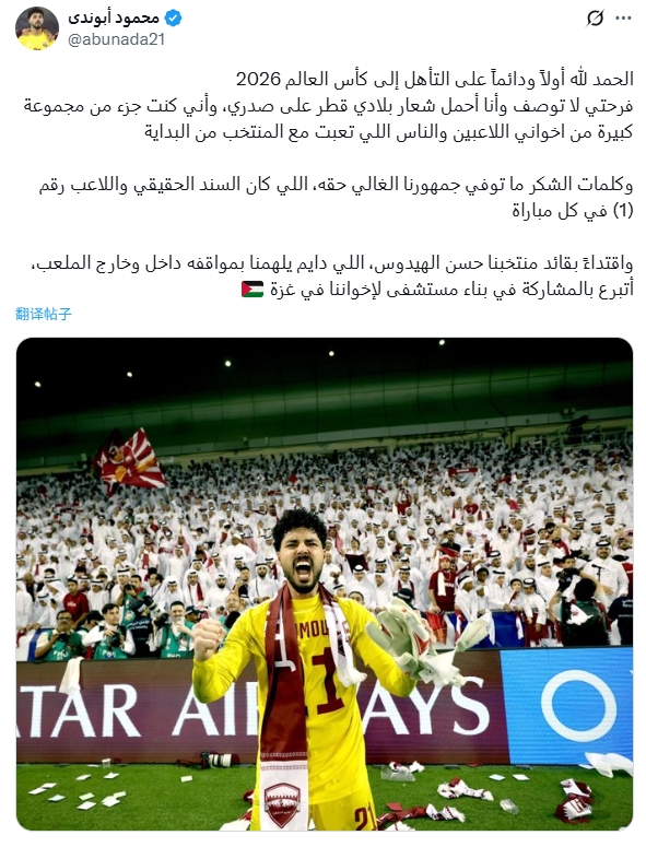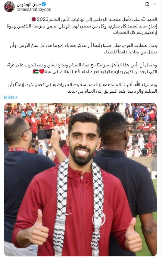 今日,卡塔尔国门马穆德-阿布纳德也发文:“我以国家队领队 海多斯为榜样,无论在场上场下他都始终以行动激励着我们,我将捐款为加沙的兄弟们建造一所医院。”
