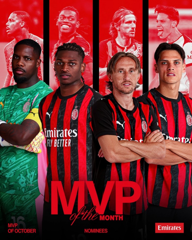 米兰官方列10月最佳候选4人名单:莫德里奇、莱奥、迈尼昂、里奇