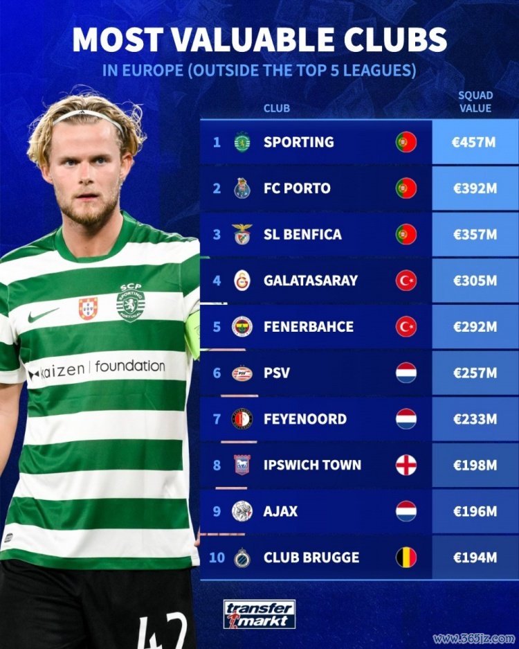五大职业联赛 之外欧洲俱乐部身价榜:葡萄牙体育、波尔图、本菲卡前三
