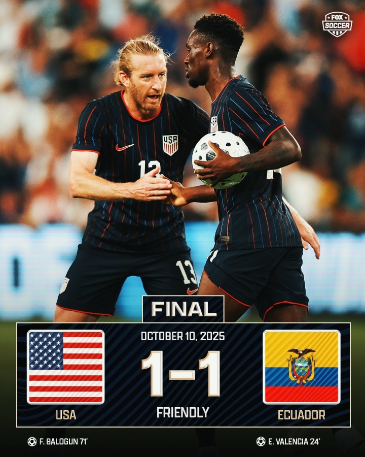 10月11日讯古代足球 运动活动 友情 赛,美国1-1战平厄瓜多尔。本场赛事 恩纳-瓦伦西亚率先破门,巴洛贡为美国队扳平比分,攻破“南美之墙”的大门。