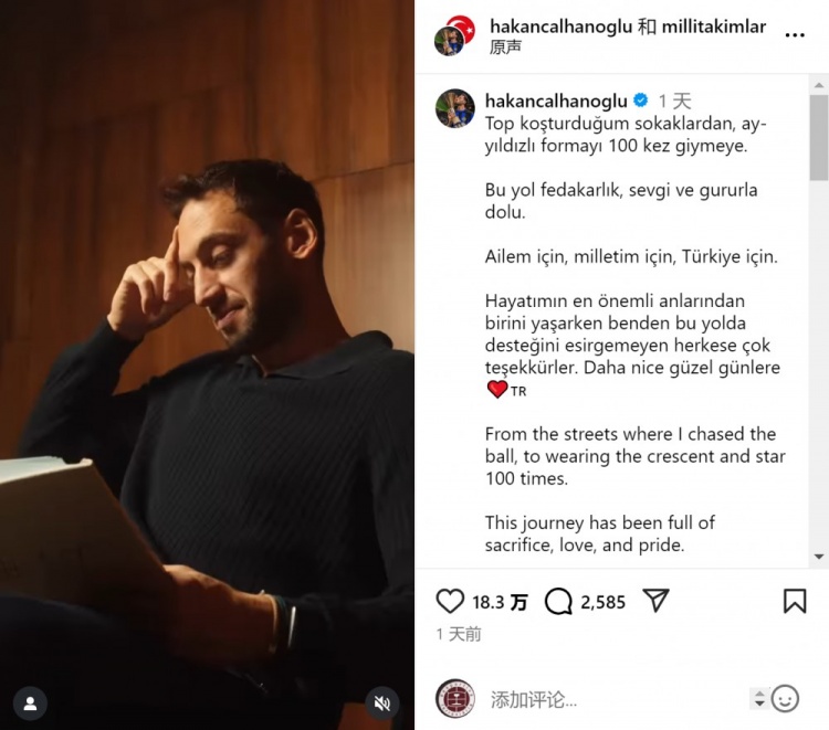 恰尔汗奥卢:从在街头射门到国家队出战百场,感谢大家的一路支持